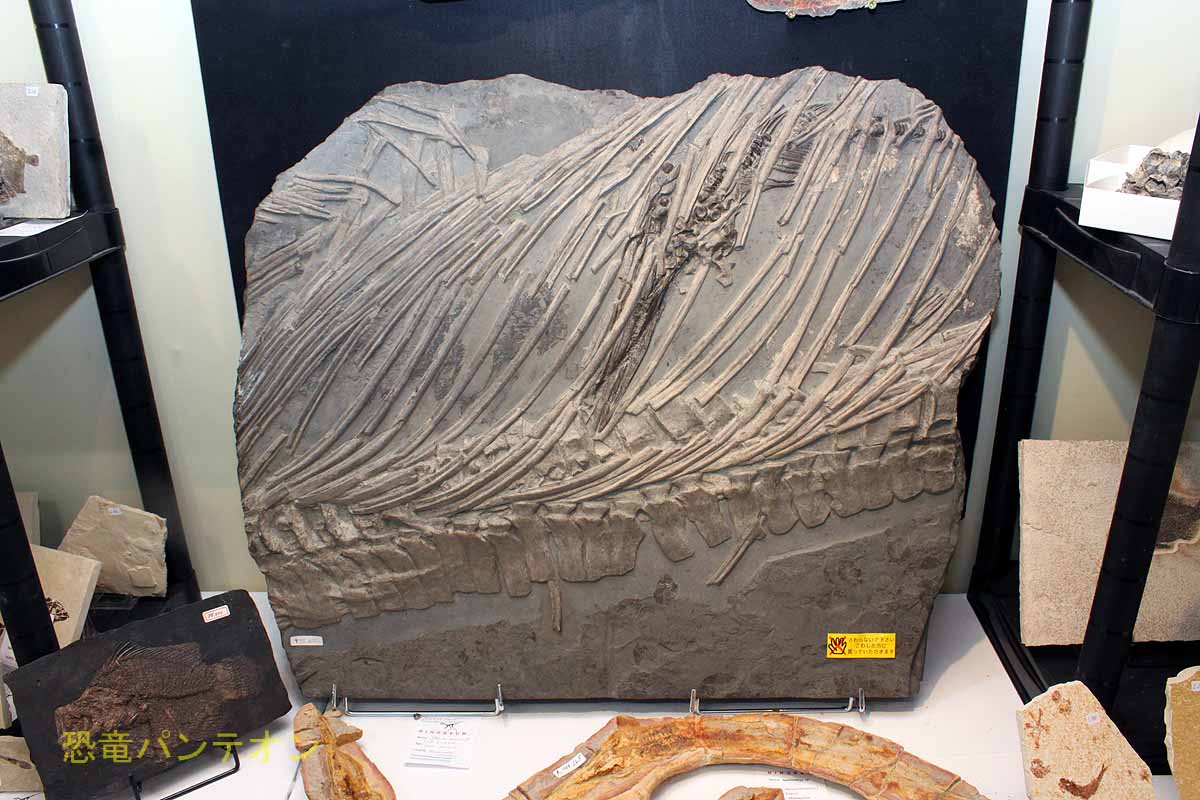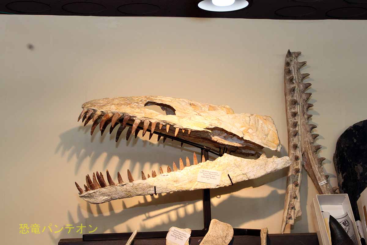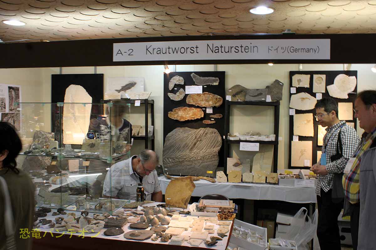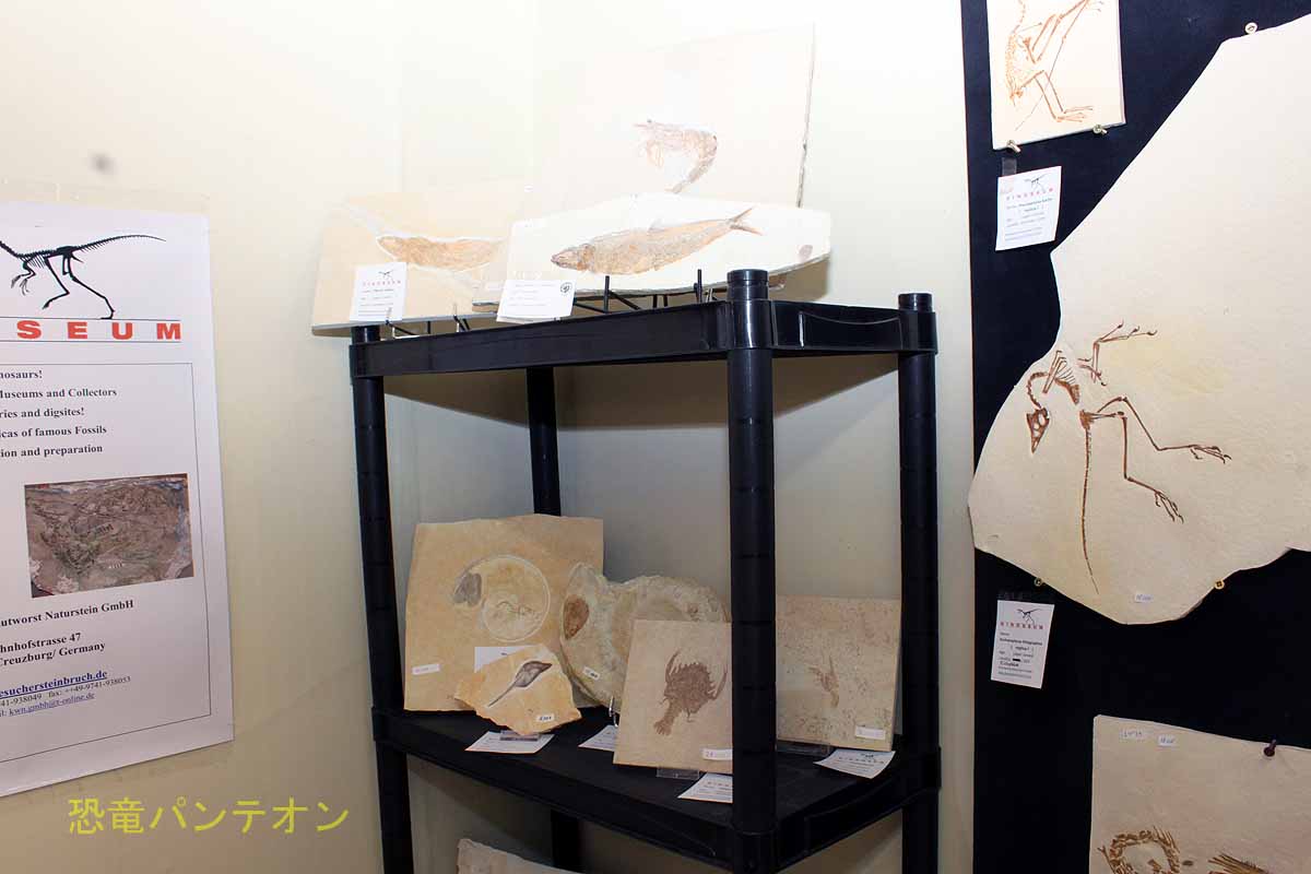 Krautworst Naturstein GmbH ドイツのお店です。ここもレプ・本物含め取り揃えいろいろで楽しいです。写真はカマラほか恐竜系の骨たち。出産途中の胎児が見える魚竜の胴体部分。展示は上下逆さなので、背骨より右上の方に胎児の骨格が見えます。これは即日売れました。